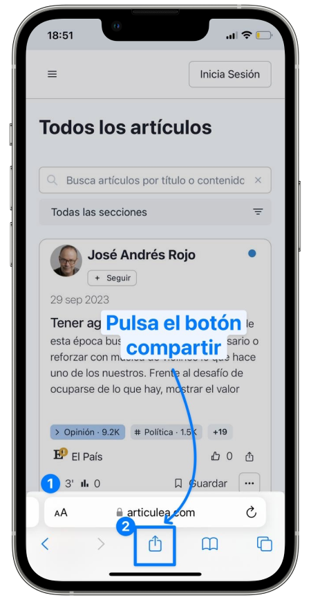 Pulsa el botón de compartir, situado en la barra central inferior (un cuadrado con una flecha hacia arriba).